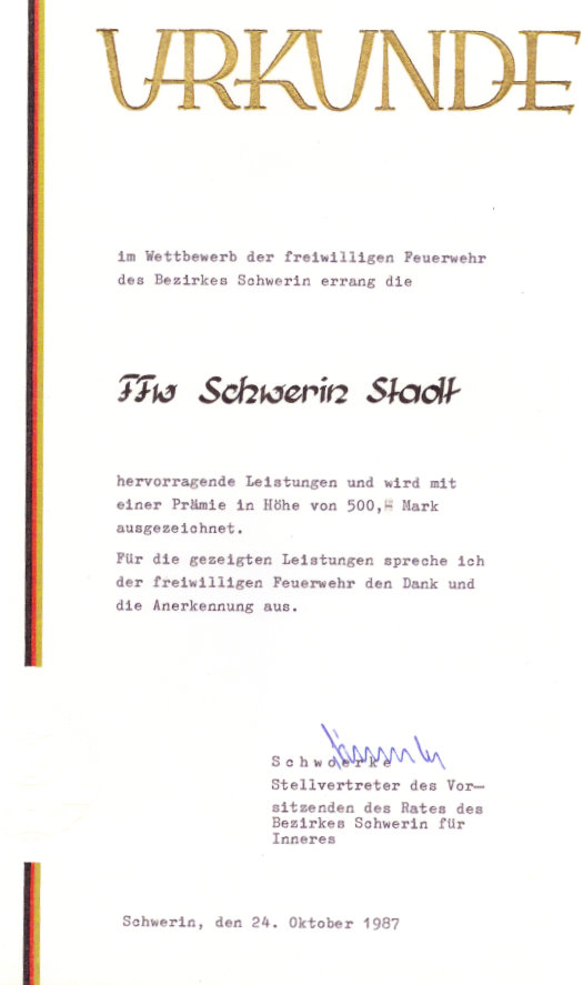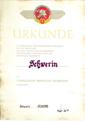 der PGH Ofenbau in die Freiwillige Feuerwehr Schwerin ein.